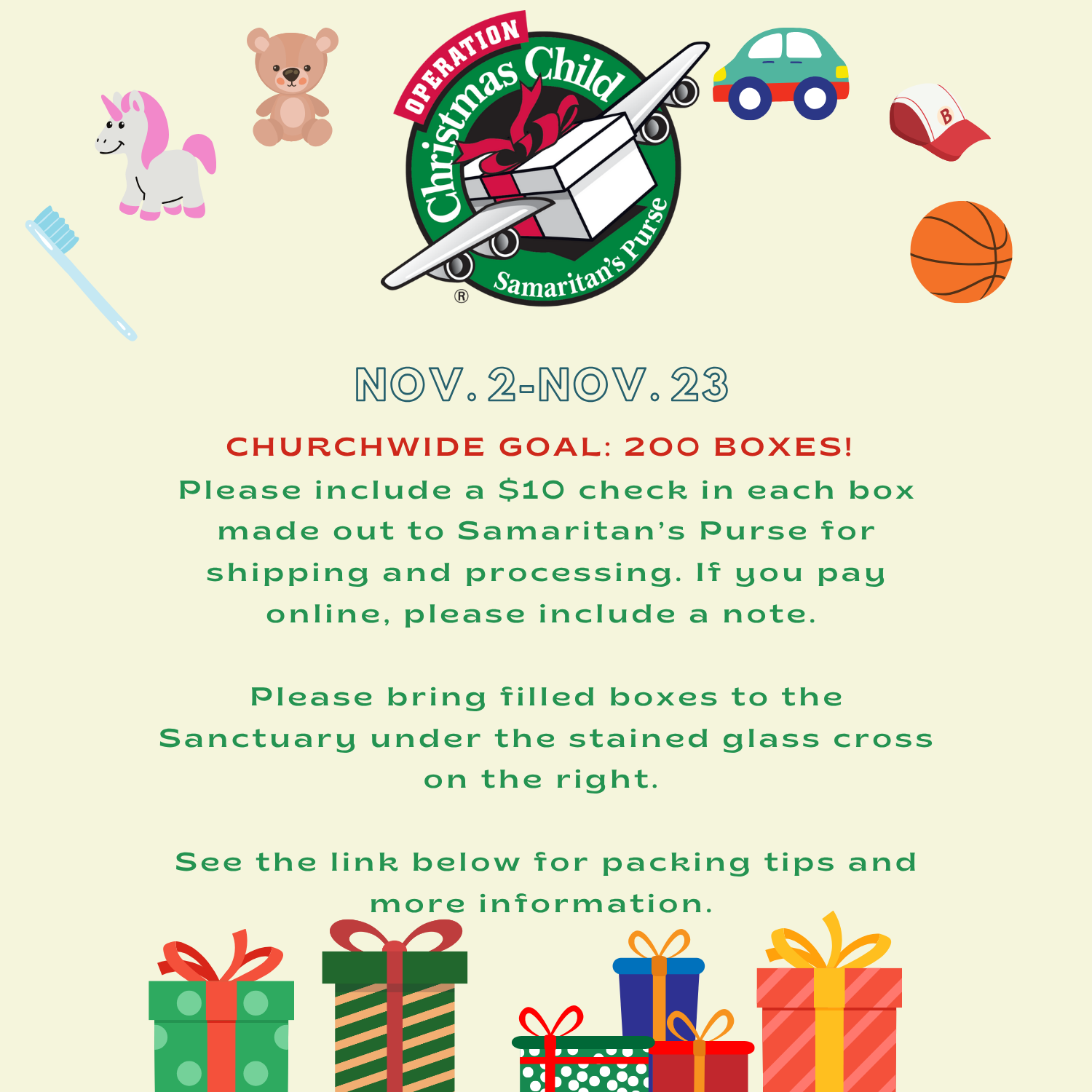 10/20/202511/04/2025 Categories: Church Announcements, Church News, Uncategorized Operation Christmas Child- Nov. 2- Nov. 23 Operation Christmas Child We will also be accepting monetary donations to provide supplies for our Kids’ Packing Party. Please make those checks out to Bay Springs and mark your offering “Kids’ Packing Party.”