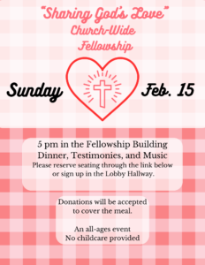 “Sharing God’s Love” Church-wide Fellowship- Sun., Feb. 15- 5 pm